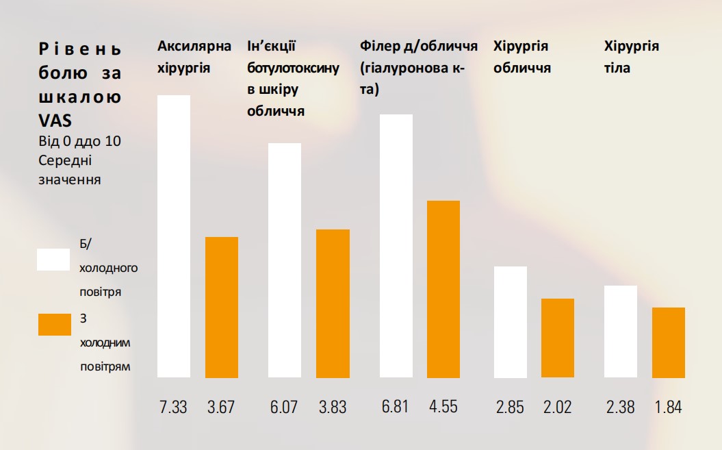 Усі групи пацієнтів відчували значно менший біль при застосуванні холодного повітря, ніж без нього. Це відповідає добре дослідженому впливу холодного повітря на рівень болю. Холодне повітря надійно знімає біль під час косметичних дерматологічних процедур. Особливо помітним було полегшення болю під час нехірургічних ін’єкцій із застосуванням філерів ботулотоксину та гіалуронової кислоти. Холодне повітря ефективно зменшує біль і дозволяє безболісно вводити ботулотоксин, гіалуронову кислоту або місцевий анестетик.