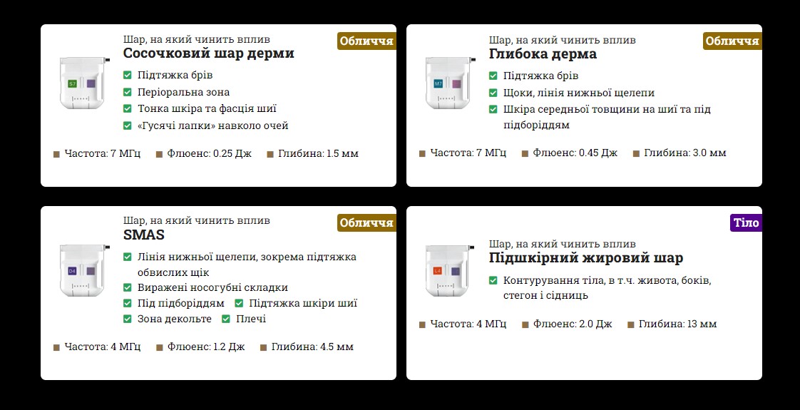 Тип енергії — HIFU (High Intensity Focused Ultrasound) – високоінтенсивний сфокусований ультразвук