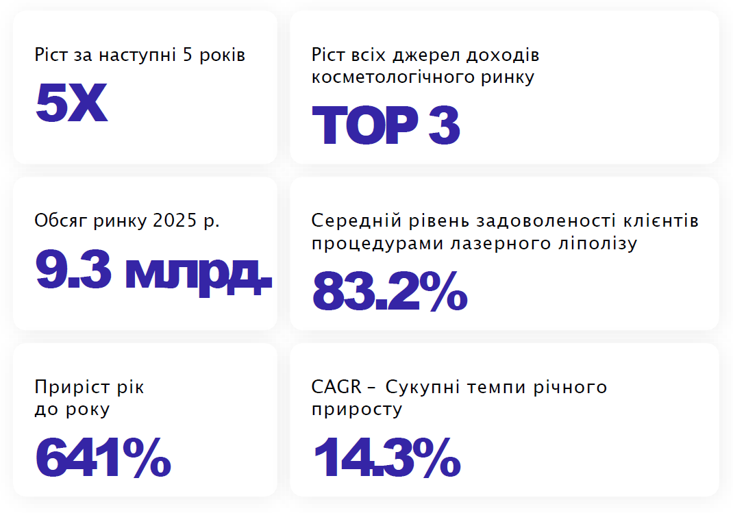 Зростання попиту на процедури лазерного ліполізу сягнуло +641% пояснюється дієвістю та комфортністю цієї технології ліполізу. Ми впровадили лазер з довжиною хвилі 1064 нм через його здатність глибоко проникати в гіподерму, де енергія поглинається жировою тканиною, внаслідок чого відбувається нагрів тканини, який провокує ліполіз та апоптоз адипоцитів. Система пильнує за охолодженням шкіри та підтриманням оптимального розподілу енергії, завдяки чому вдається уникнути перегріву шкіри та зробити процедуру комфортною.
