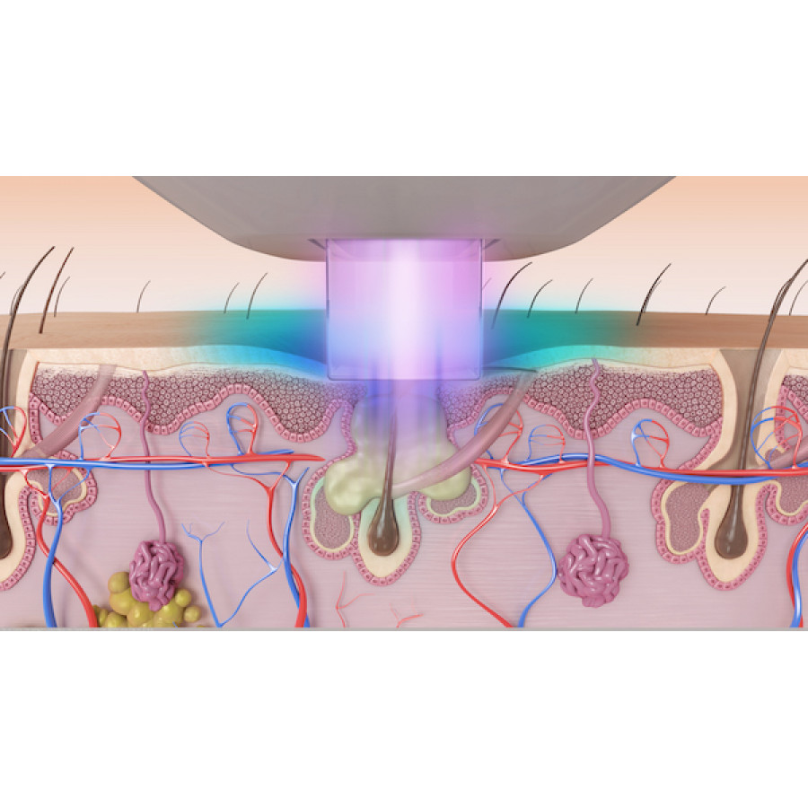 Імпульсна насадка AC Dual формує біхроматичний пучок світла у двох діапазонах. Синє світло націлене на знищення бактерій P.acnes, що викликають утворення вугрової висипки, а червоне - на зняття запалення, якнайшвидше загоєння і неоколагенез.