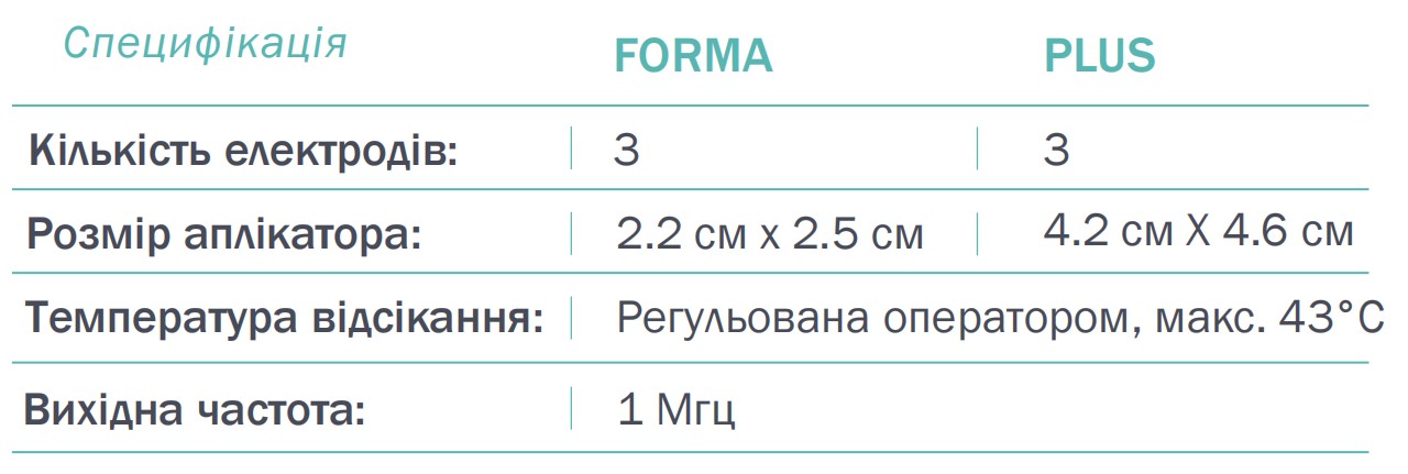 Forma та Plus - це інноваційні термальні технології, які спрямовують таргетовану двополярну радіочастотну енергію у дерму та субдермальний шар. Інтелектуальний моніторинг стану епідермісу забезпечує неінвазивні безболісні процедури, які є беззастережно безпечними та вражаюче ефективними. Вбудовані термістори автоматично коригують рівень RF, вимірюючи температуру шкіри 1000 разів щосекунди, завдяки чому оброблення тканини завжди відбувається за клінічно оптимальних температур. Forma призначена для менших ділянок, а Plus для великих зон і ділянок тіла.