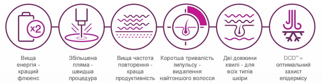 Обидві довжини хвилі (755 нм і 1064 нм) мають широке коло застосування на всіх типах шкіри. Завдяки цьому платформа пропонує функціонал, який виходить далеко за рамки видалення волосся.