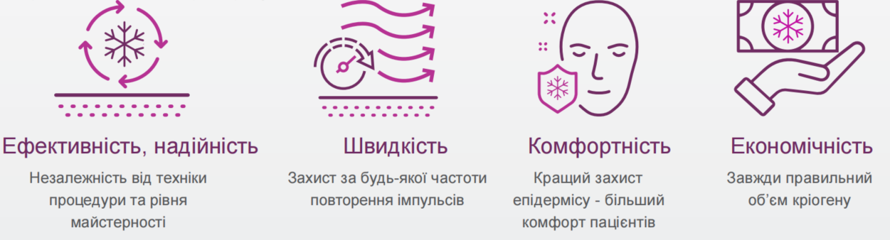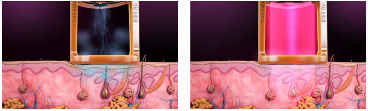 - Система охолодження поліпшує комфортність процедури для пацієнтів і забезпечує захист епідермісу шляхом таргетованих викидів кріогену на верхній шар шкіри. Ці викиди відбуваються за мілісекунди до лазерного імпульсу (а опціонально - і після нього).