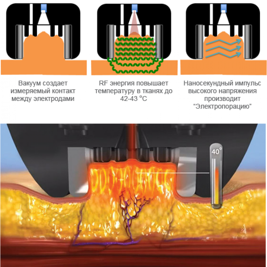 Радіочастота забезпечує точне та оптимальне нагрівання шкіри для зменшення, скорочення та корекції контурів тіла.