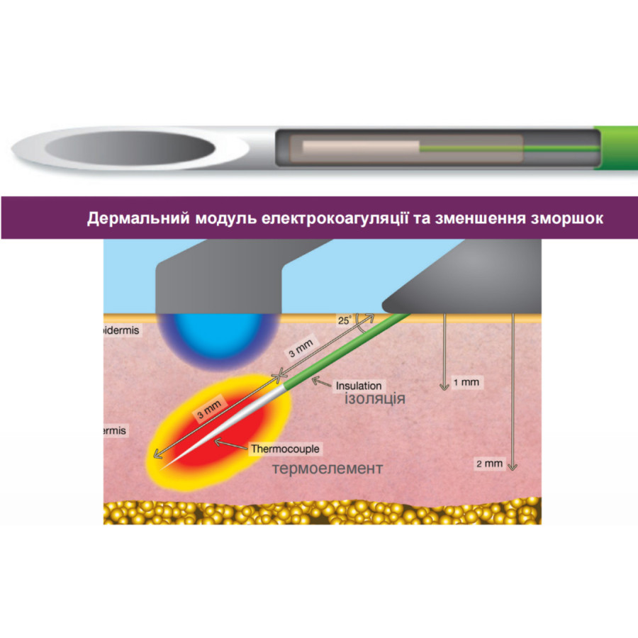 - Біполярна RF-енергія досягає ретикулярної дерми і завдає теплового пошкодження без теплового впливу на епідерміс.