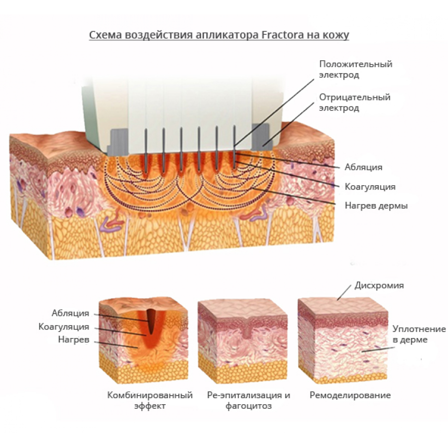 Fractora доставляє спрямовану біполярну енергію RF на різну обрану глибину в шкірі. Fractora досягає і перевершує результати фракційного СО2 лазера, але без пов'язаного з ним відновлювального періоду, еритеми, що тривало зберігається, і порушення пігментації.