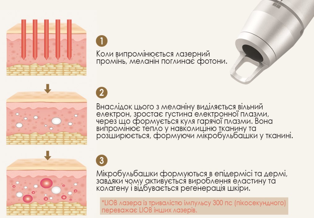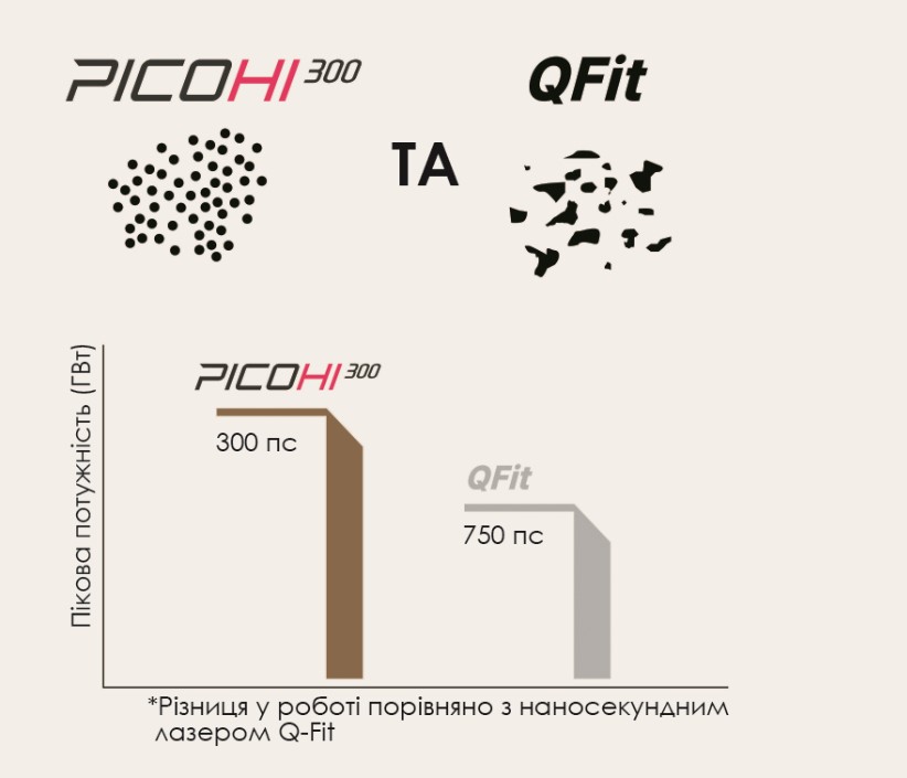 PICOHI 300 видаляє пігменти шляхом подрібнення їхніх часточок, і робить це єффективніше за інший наш лазер Q-Fit (наносекундний лазер).