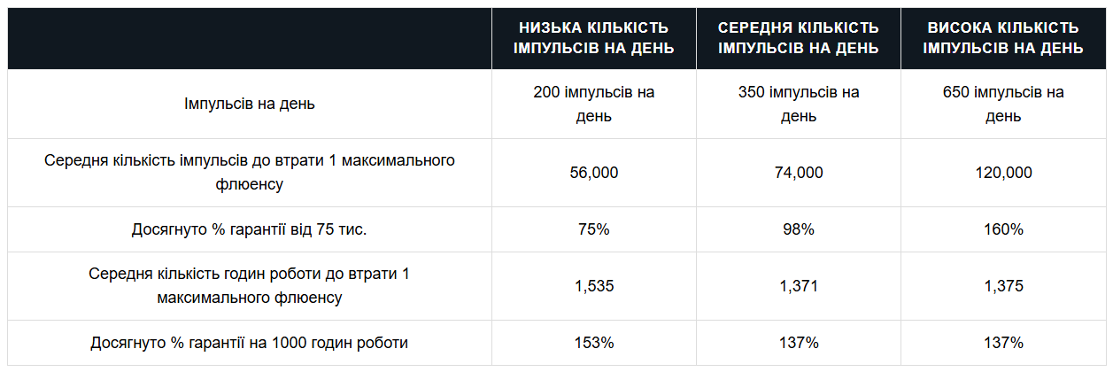 Ресурс до 75,000 імпульсів або 1,000 годин роботи, створення власних протоколів, система динамічного охолодження.