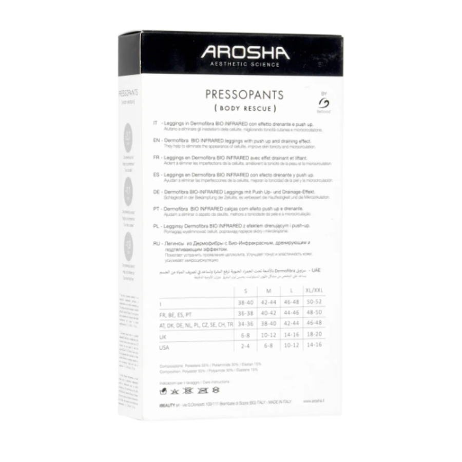 Легінси Arosha покращують тонус та еластичність шкіри, посилюють мікроциркуляцію, допомагають усунути прояви целюліту. Унікальна технологія DERMOFIBRA® — поліестерова нитка, в яку за допомогою нанотехнологій впроваджені органічні кристали.