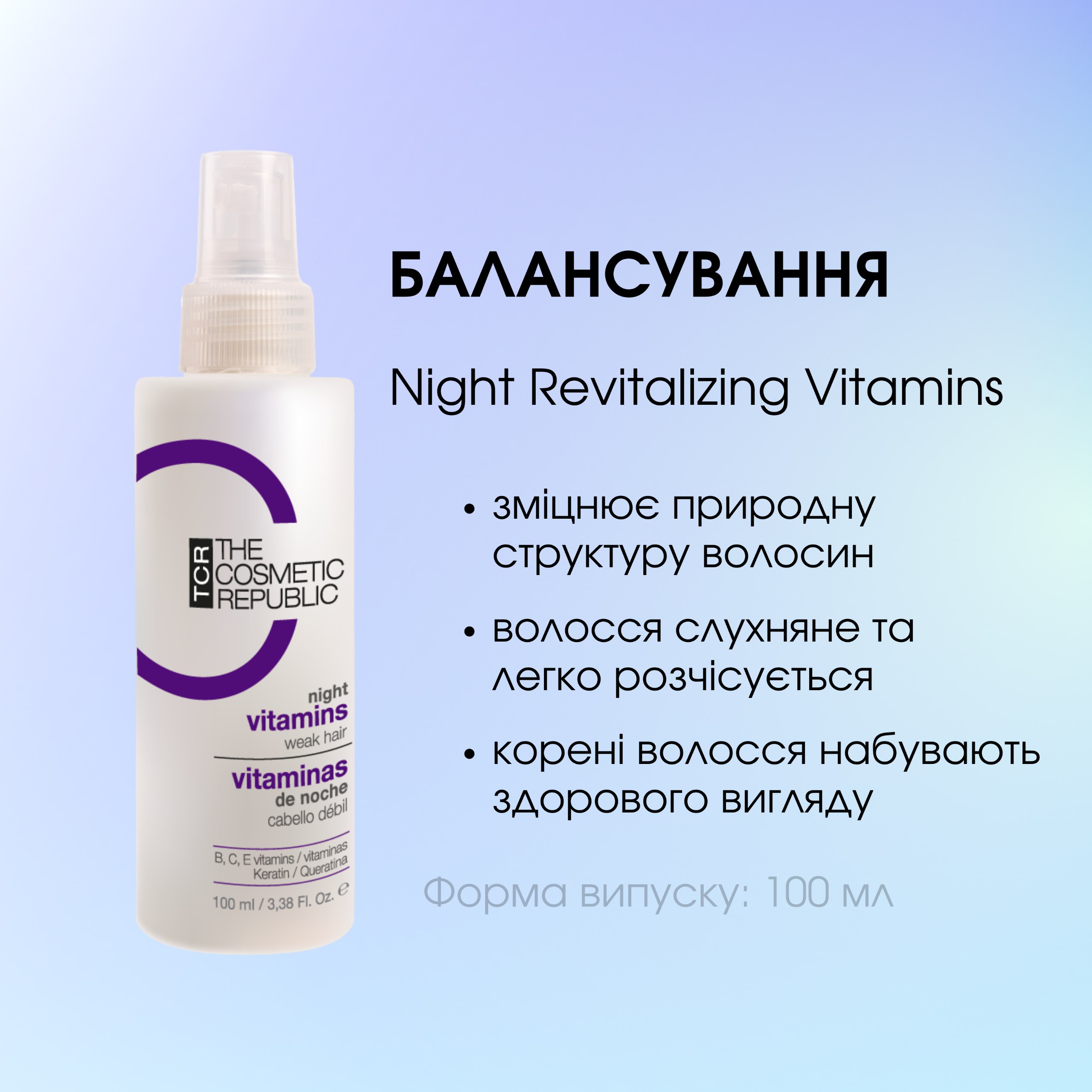 - БАЛАНСУВАННЯ: перед сном нанесіть нічний вітамінний коктейль Night Revitalizing Vitamins на шкіру голови для глибокого живлення її клітин.