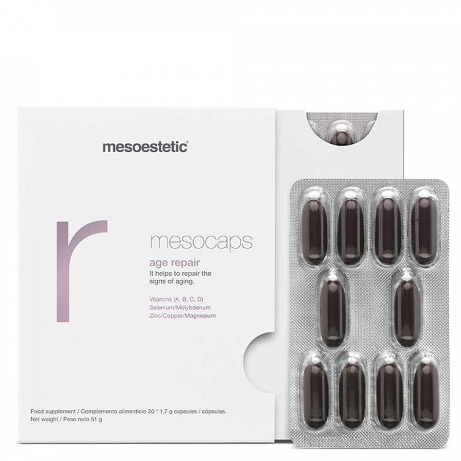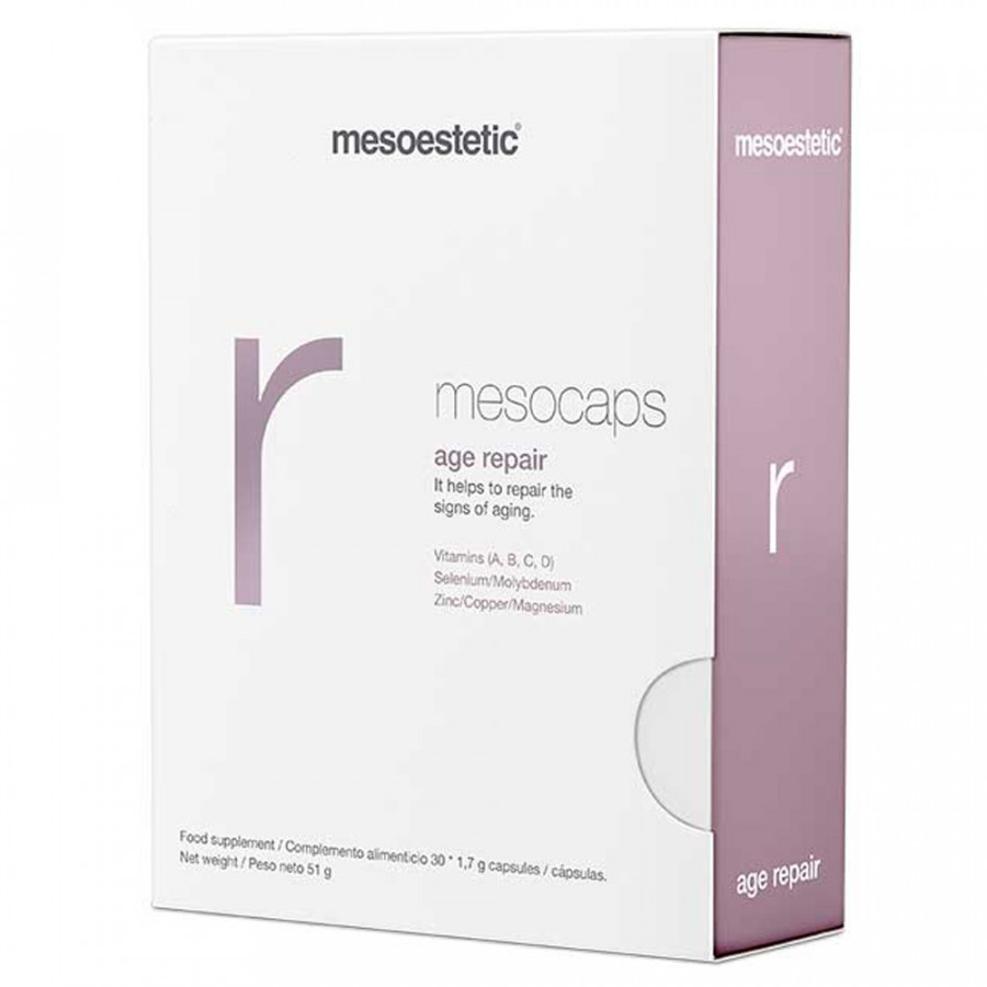 Mesoestetic Age Repair – біологічно активна добавка для запобігання всім стадіям старіння шкіри. Поєднання водорозчинних та жиророзчинних вітамінів перешкоджає передчасному старінню шкіри. Активні елементи з антиоксидантними властивостями покращують енергетичний обмін та борються проти окисного пошкодження шкіри, запобігаючи появі зморшок та ознак млявості.