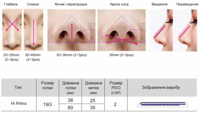 Hi Rhino – ліфтингова нитка для безопераційної корекції носа. Нитка вводиться в перегородку, спинку, кінчик та крила носа.
