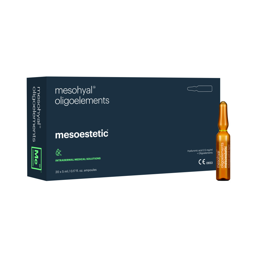 Коктейль mesohyal OLIGOELEMENTS складається з гіалуронової кислоти, пов'язаної з 9 мікроелементами, що забезпечує активацію біологічних процесів у шкірі, прискорення обмінних процесів у клітинах, покращуючи тим самим структуру шкіри та усуваючи ознаки старіння.