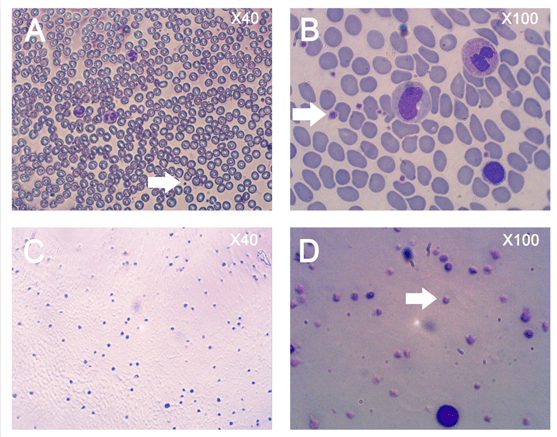 Гематологічний аналіз PRP цільної крові. (A-B) Пофарбовані мазки цільної крові, що містять численні еритроцити і лейкоцити. І мазки PRP (C, D) містять переважно тромбоцити (стрілка), еритроцити та гранулоцити відсутні.