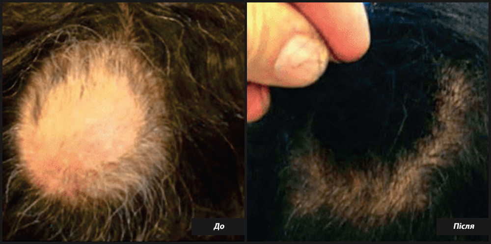 - Випадіння волосся будь-якого типу (андрогенне, гніздове, дифузне)